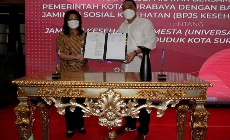 Jatim detik – Pemerintah Kota (Pemkot) Surabaya dan BPJS Kesehatan melalukan penandatangan MOU Jaminan Kesehatan Semesta (Universal Health Coverage) untuk warga Kota Surabaya. Jaminan Kesehatan Semesta adalah ketika sebuah kota 95% warganya sudah tercover BPJS, siapapun yang sakit cukup menggunakan KTP bisa dilayani kesehatan.