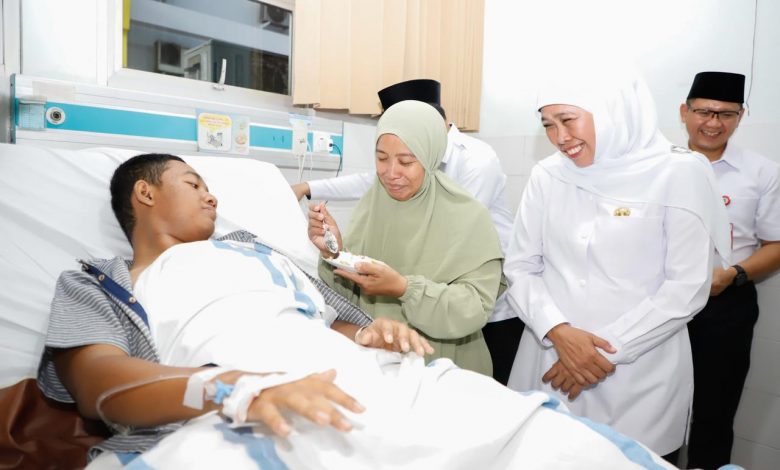 jatim detik – Gubernur Jawa Timur, Khofifah Indar Parawansa, menjenguk Anzumil, siswa SMAN 1 Sidoarjo yang merupakan korban laka bus pada kegiatan kunjungan kampus ke Universitas Gadjah Mada (UGM) Yogyakarta Selasa (16/1/2024) lalu. Azumil kini dalam mendapatkan perawatan di RSUD Sidoarjo.